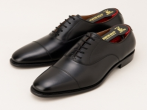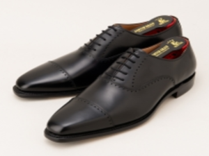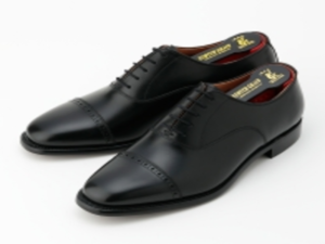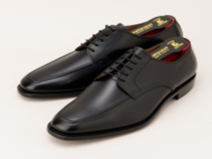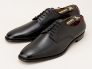 外羽根のプレーントゥです。シンプルイズベストでストレートチップ並みの汎用性を誇ります。極めてシンプルなので履きこなすのが意外と難度が高いです。ビジネスシーンでブラックのプレーントゥをかっこよく履こうと思ったらスタイル、上下服装、装飾品をひっくるめたトータルバランスが良くないと不恰好になってしまう、そんな危険性を孕んでいます。ぼてっとさせるかシュッとスマートに見せるかはそのバランス次第。靴に限らず柄・装飾の入っていないものは他との兼ね合いで大きく印象が変わるため、その点は注意しよう。