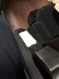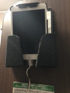 iPad miniは座席の仕切に壁掛けされています。LightningCableで常に給電されており、抜く事ができないように端子部分を触れないよう加工されています。ケーブルを切り取れば持っていかれるのではないかと思いましたが、黒いケーブルが防犯対策なのでしょう。