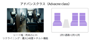 シート幅は下位グレードのアドバンスクラスでも46.5cm、新幹線のぞみ普通車指定席が40cm、グリーン車が50cmであることを考えると中々ゆとりがあります。プレシャスクラスに至っては61cmもあり、夜行バスのシートとしては最大級です。