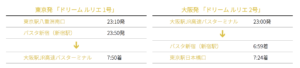 大阪発、東京発がそれぞれ1日1便ずつ。出発時間23時以降、到着時間7時半と、ありがたい設定となっています。