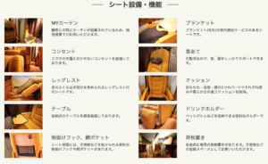 コンセント、網ポケット、荷物置き、首あて、ブランケットが搭載されており、