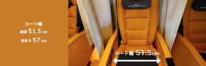 シート幅は座面で51.5cm、肘掛込みで57cmと、他のバスと比べてもゆったり目なのが特徴です。
