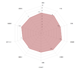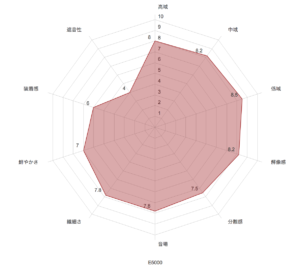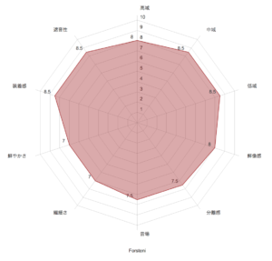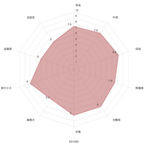 • 分離感:各パートを分解できる能力。解像感が高くても音がほぐされているタイプもあれば、分離感が気にならないタイプもあるので別項目とします。
