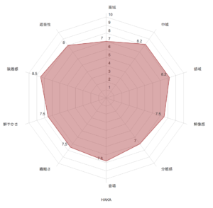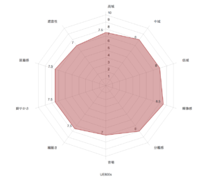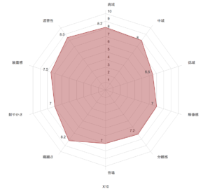 各モデルに付けているチャートは、その機種の特徴を視覚化するためのものです。例えば「AとBという2つのモデルを重ねてみたらチャート上はAの方が上なのに実際聴くとBの方がええやんけ」となる可能性もなきにしもあらず。評価項目は10要素を並べてみました。100%、私の独断と偏見による評価になるため参考の中の参考にして頂ければ。