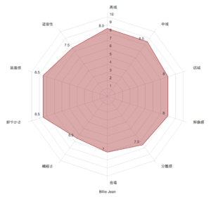 • 低域:低音の質、量、深さを総合的に。バスドラム、ベースの鳴り方に特徴があれば加点。