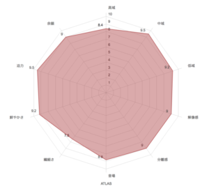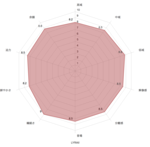 音質としてはそれまでのダイナミックモデルとは打って変わってBAマルチのような全帯域にわたって濃密なサウンドを奏でてくれます。とにかくエネルギッシュで、情報量が多すぎるからこそ聴き疲れしやすいデメリットも。
