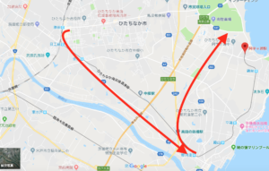 通常ルートだとこのように、勝田駅から真東にまっすぐバスに揺られれば通常20分、混雑時は30分程度で会場に着くのですが、炎天下の中での待ち時間が1時間±30分という苦行を強いられます。待ち時間と合わせてトータル2時間弱掛かる可能性もあります。