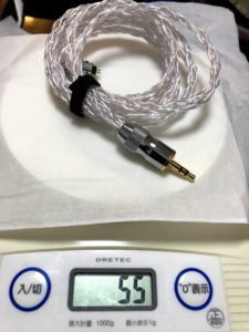 最後にSXC8。重量は50gオーバーと圧倒的。このケーブルは線が太い上にかなり長いので一纏めにすると生卵以上の重さになるのですが、一番ゴツいのはプレイヤーに挿し込む端子部分。